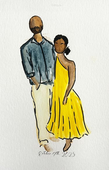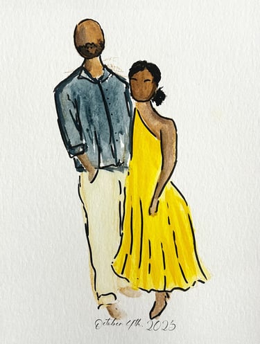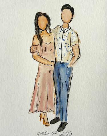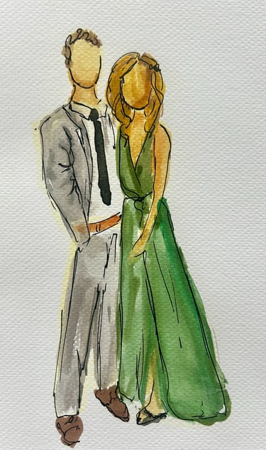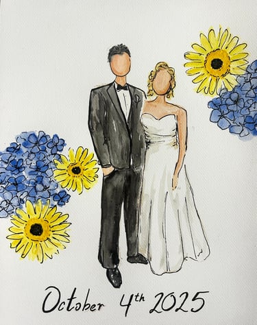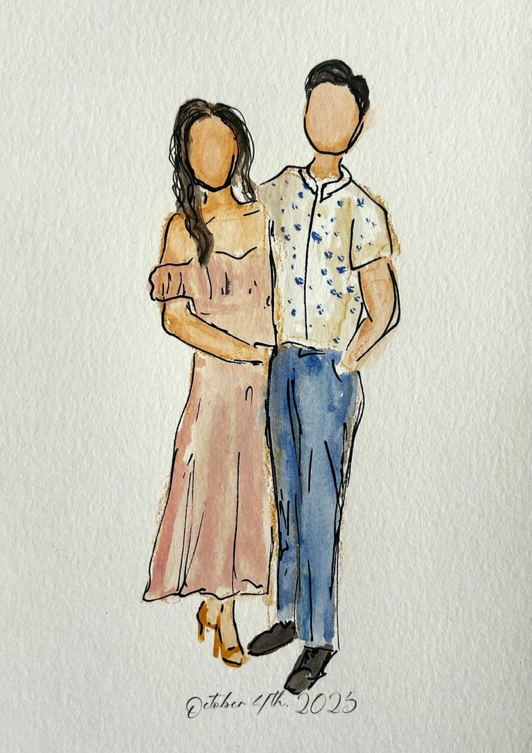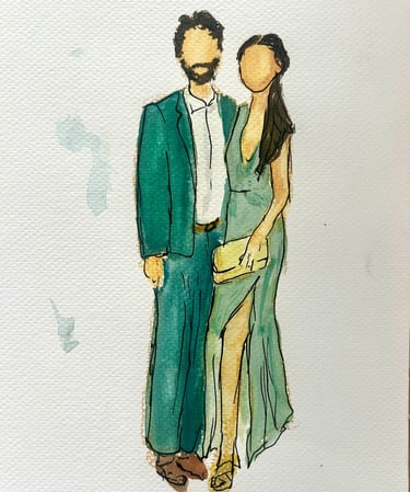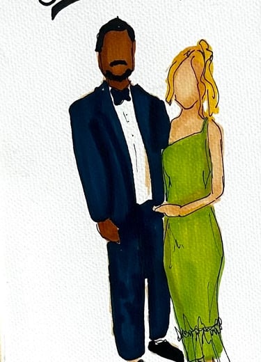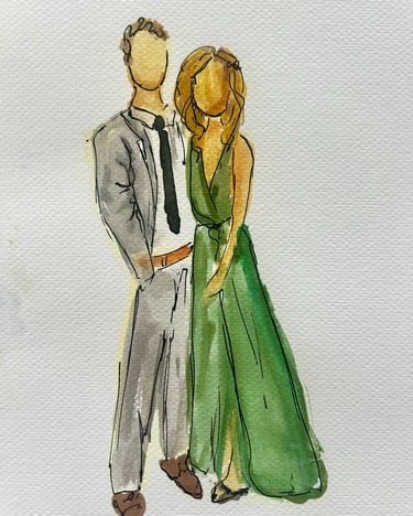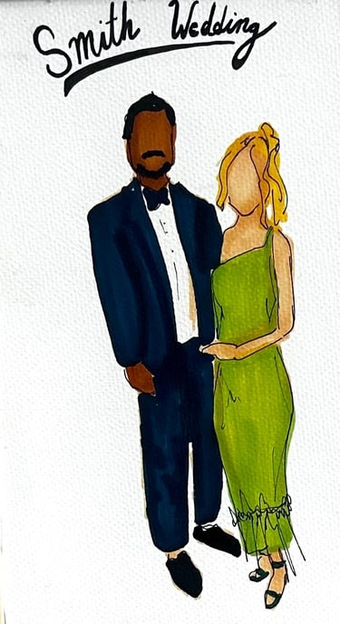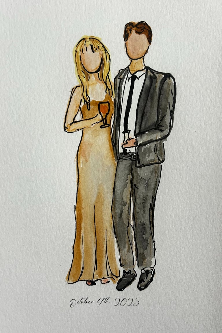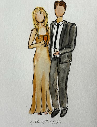 Elevate your wedding or event with live, high-quality sketched portraits for your guests. A perfect addition to weddings, corporate events, and bridal showers, these fine art sketches offer both unique entertainment and a personalized keepsake they’ll treasure. Each sketch is created in Jenna’s signature style—elegant, flowing, and expressive. Full-body portraits can be created in marker or watercolor and customized with your event name and date for a lasting memento. Jenna brings warmth and creativity to every interaction, ensuring your guests leave with a memorable experience.