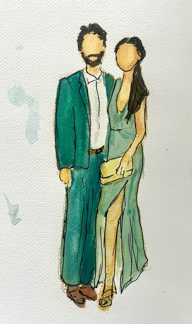 Jenna completes 6–10 sketches per hour and sets up at your event or reception for 3–7 hours, creating live portraits as guests visit her table. Guests are welcome to watch and chat as their custom fashion sketch comes to life. Each sketch is personalized, branded with your event details, and packaged in protective paper for a beautiful takeaway. All materials are provided by the artist.